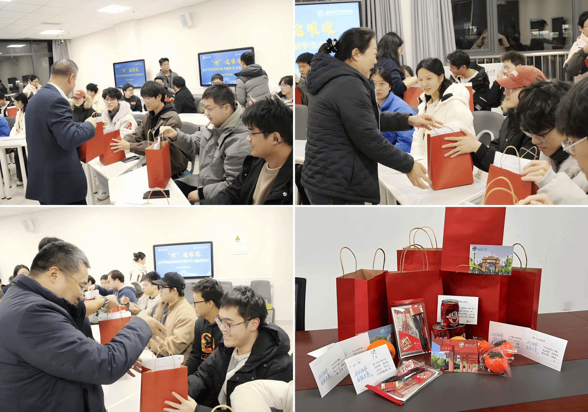殷殷寄语暖心,聚力冲刺前行。活动现场,领导与老师们亲手为同学们送上特别的“暖心礼包”,凝聚着肉漫 对考研学子美好的祝愿。礼包里面有学弟学妹们亲手书写的“笔锋所至,梦想开花”的明信片;好“柿”发生的解压捏捏乐;一战“橙”硕的新鲜水果;“下笔有神”的考试用具;“旺”气加持的旺仔牛奶。