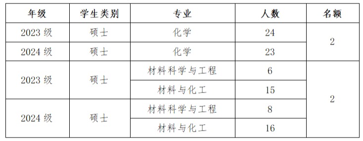 2.硕士研究生国家奖学金名额4名:按照理学类(化学)和工学类(含材料科学与工程、材料与化工)学生人数,按以下名额分配。