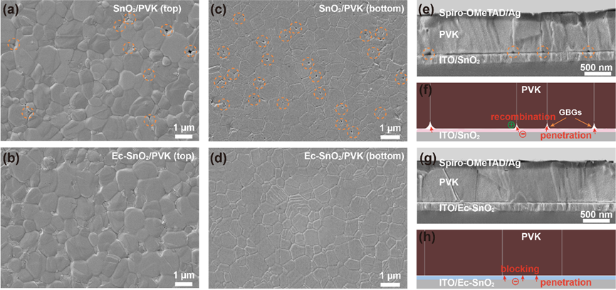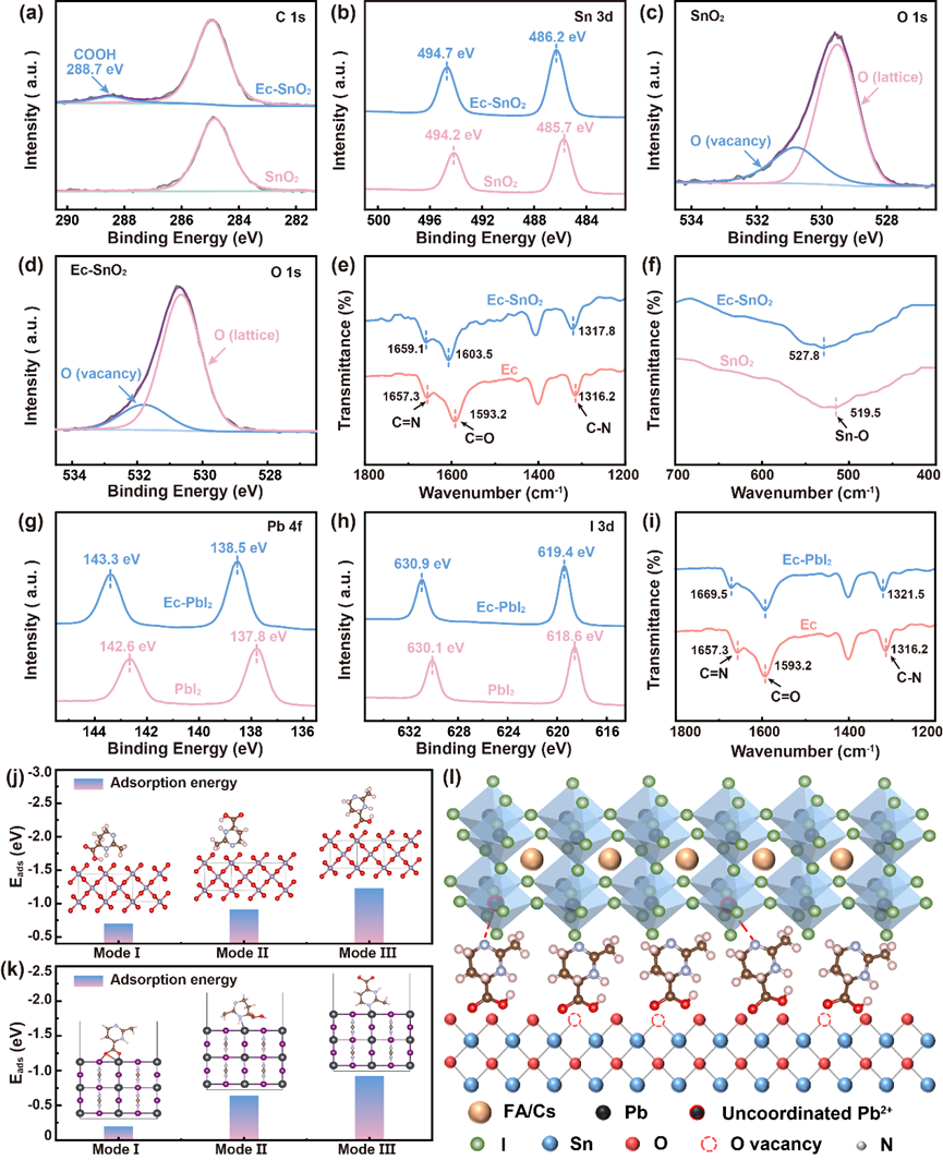 图2. Ec与SnO2和钙钛矿的相互作用与分子桥接机制。