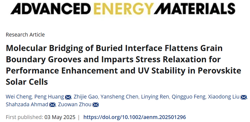 周祚万教授指导的博士研究生程伟同学在钙钛矿太阳能电池埋底界面调控方面的研究取得重要进展,相关研究成果以“Molecular Bridging of Buried Interface Flattens Grain Boundary Grooves and Imparts Stress Relaxation for Performance Enhancement and UV Stability in Perovskite Solar Cell”为题发表在最近出版的国际能源材料顶刊《Advanced Energy Materials》上。程伟为第一作者,肉漫