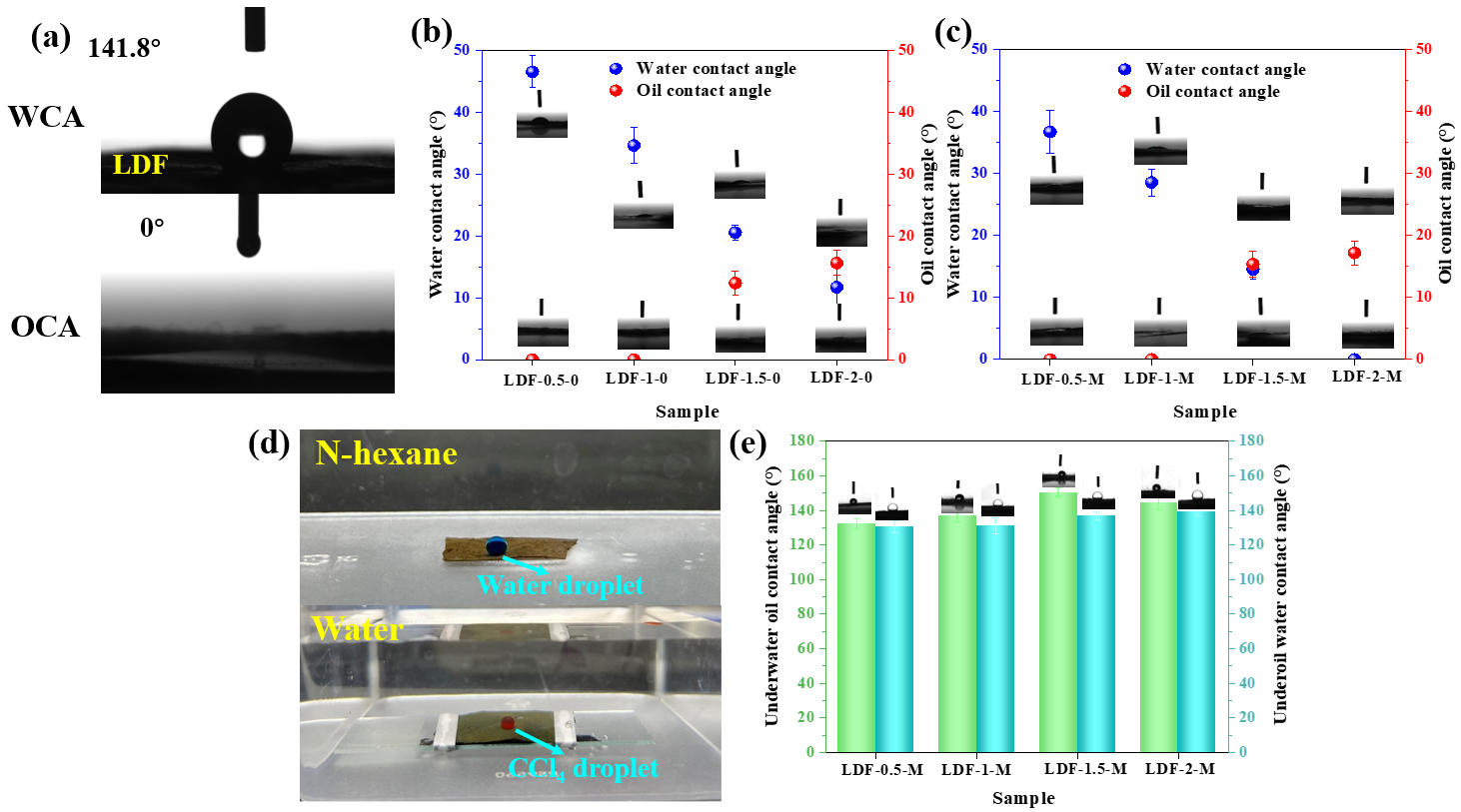 图2 (a) LDF膜的水接触角和油接触角;(b) LDF-c-0膜的水接触角和油接触角变化;(c) LDF-c-M膜的水接触角和油接触角变化;(d) LDF-2-M膜的油下水接触角和水下油接触角的数码照片;(e) LDF-c-M膜油下水接触角和水下油接触角的变化