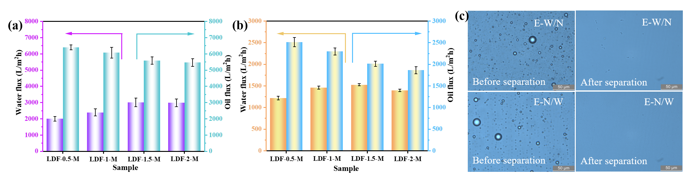 图3 (a) LDF-c-M膜的纯水通量和油通量;(b) LDF-c-M膜在分离水包油乳液时的水通量和分离油包水乳液时的油通量;(c)水包油乳液和油包水乳液分离前后光学照片的变化