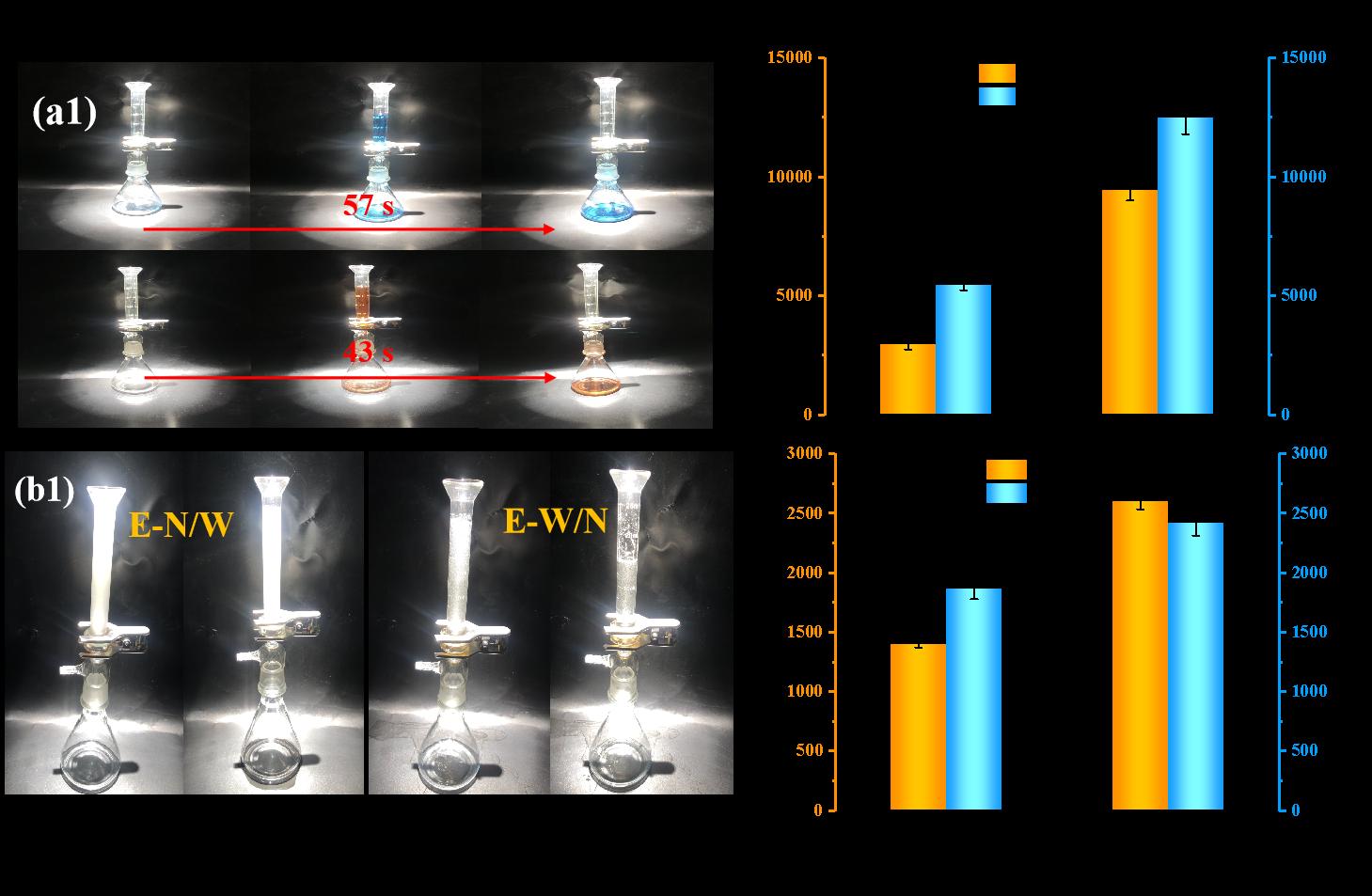 图4 (a1)光照下LDF-2-M膜的纯水通量和油通量数码照片;(a2) LDF-2-M膜的纯水或油通量在有光和无光条件下的对比;(b1)光照下LDF-2-M膜乳液分离时的水通量和油通量数码照片;(b2) LDF-2-M膜的分离乳液时水或油通量在有光和无光条件下的对比