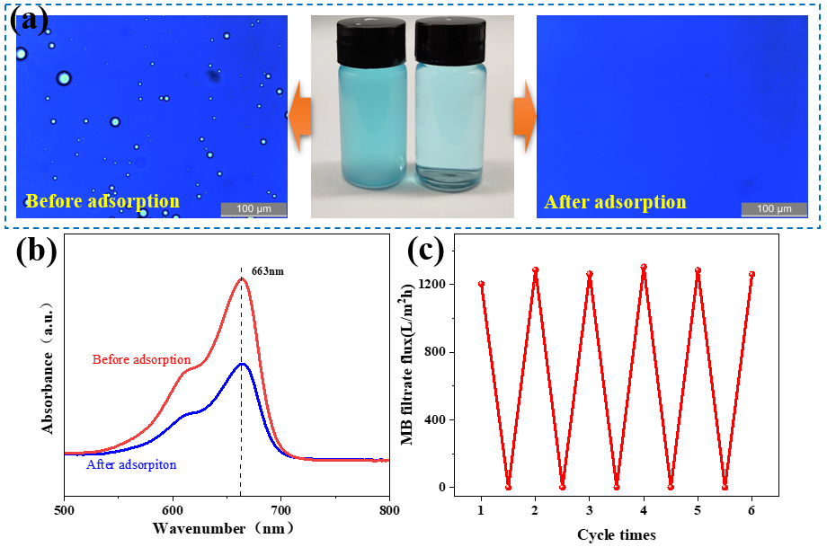图6 (a)经LDF-2-M膜分离前后含MB的E-N/W溶液的光学图像和数码照片,(b) E-N/W溶液和滤液的紫外可见光谱,(c)分离MB乳液时水通量随循环次数的变化