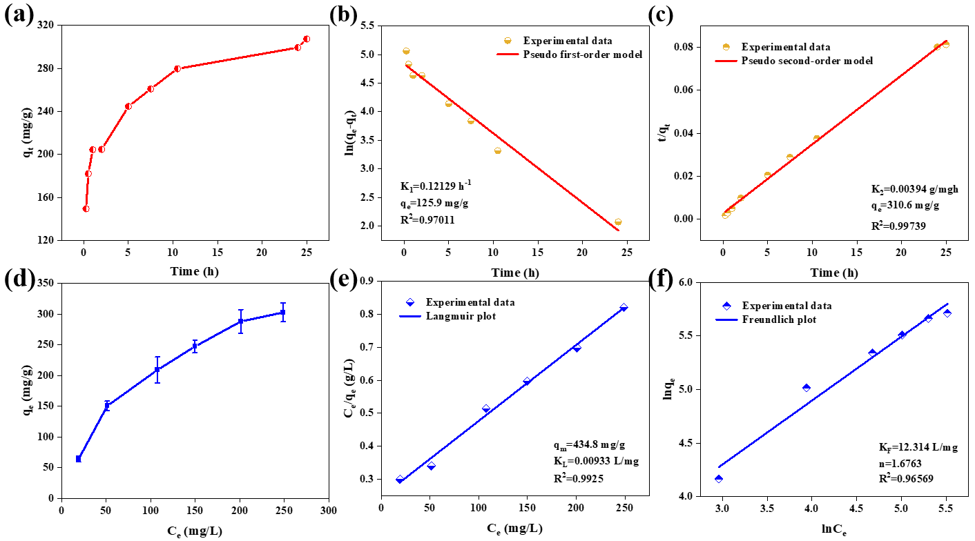 图5 (a) LDF-2-M对MB的吸附容量随吸附时间的增加而变化,用(b)伪一阶动力学模型模拟图模拟曲线;(c)伪二阶动力学模型模拟曲线。(d) LDF-2-M对MB的吸附量随MB浓度的变化,曲线分别采用(e) Langmuir和(f) Freundlich模型模拟