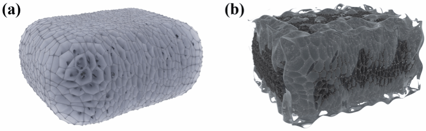 图4. 通过冷冻干燥(石墨烯片分散在聚合物基体中)(a)和浸润(石墨烯气凝胶涂有聚合物)(b)制备的气凝胶基EMI屏蔽材料的示意图。