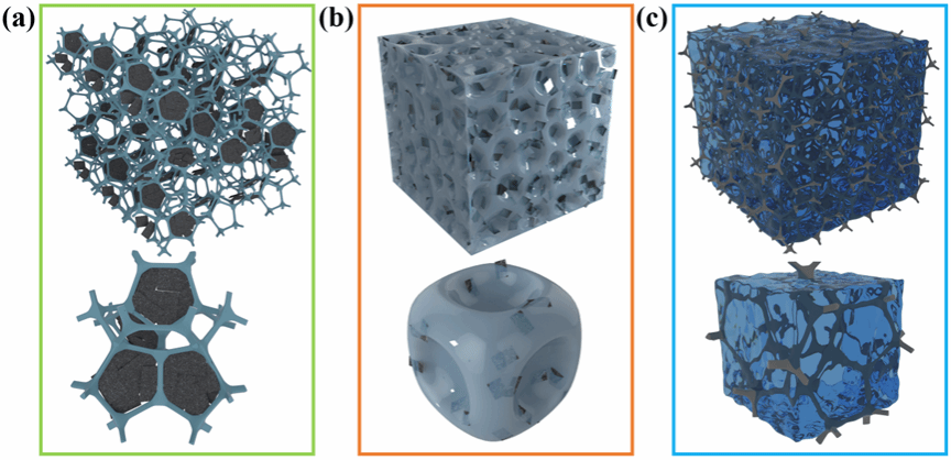 图3. 通过浸涂(石墨烯片覆盖在泡沫骨架上)(a)、CO2发泡(石墨烯片填充在泡沫骨架内部)(b)和CVD(石墨烯泡沫涂有一层聚合物)(c)制备的泡沫基EMI屏蔽材料的示意图。