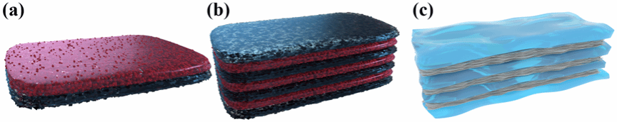 图2. 由多孔碳/聚合物层和石墨烯/聚合物层组成的双层膜(a)、由多孔碳/聚合物层和石墨烯/聚合物层组成的多层膜(b)以及由多孔石墨烯层和聚合物层组成的多层膜(c)的示意图。