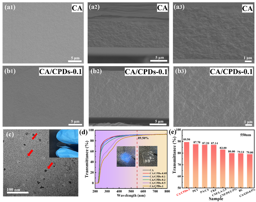 图3. (a1) CA 和 (b1) CA/CPDs-0.1 的表面形貌:(a2-a3) CA 和(b2, b3) CA/CPDs-0.1 在不同放大倍数下的横截面形貌;(c) CA/CPDs-0.5 的 TEM 图像;(d) 紫外可见光透射光谱;(e) CA/CPDs-1 复合薄膜与其他文献报道的薄膜在 550 nm波长处的透射率比较:聚对苯二甲酸乙二醇酯(PET);尼龙纳米纤维增强醋酸纤维素薄膜(PA/CA);纤维素纳米纤维/2 wt%木质素磺酸盐复合薄膜(CNF/LA-2.5);纤维素/氢氧化钾(KOH)复合薄膜(CKF);纤维素纳米纤维/5 wt% 聚对苯二甲酸乙二酯复合膜(CNF/PET-5%);再生纤维素薄膜(RC)以及醋酸纤维素/0.5 wt % 氧化石墨烯复合膜(CA/GO-0.5%)。