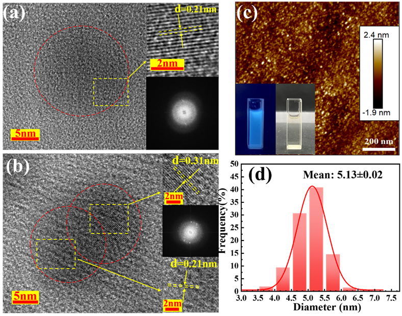 图2. CPD s的微观形态特征:(a)和(b)HR-TEM 图像;(c)原子力显微镜图像和(d)相应的粒度分布;(c)中的插入照片分别代表紫外线(左)和自然光(右)照射下的 CPDs溶液。