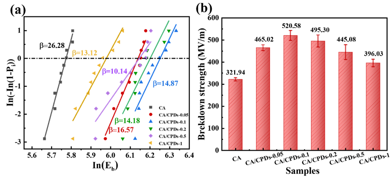 图5:(a) 击穿强度的 Weibull 分布;(b) 纯 CA 薄膜和 CA/CPDs薄膜的击穿强度特性比较。