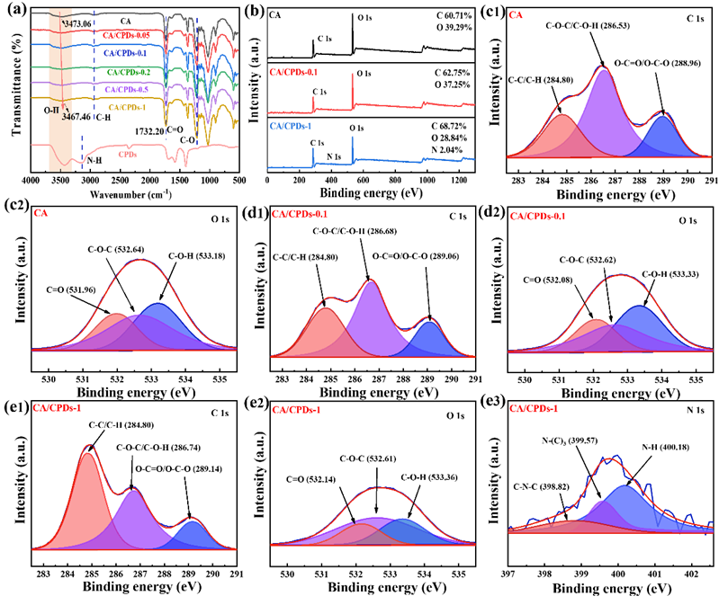 图4:(a) 所示不同样品的 FITR 光谱;(b) CA、CA/CPDs-0. 1和CA/CPDs-1的XPS全谱图以及高分辨率峰:CA 的 (c1) C1s 和 (c2) O1s 峰,CA/CPDs-0.1 的 (d1) C1s 和 (d2) O1s 峰,以及 CA/CPDs-1 的 (e1) C1s、(e2) O1s 和 (e3) N1s 峰。
