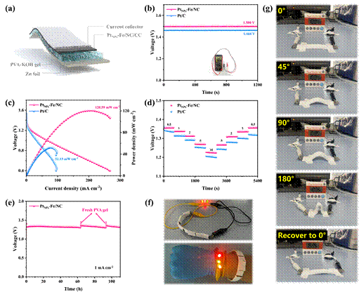 在这项工作中,作者基于Pt金属的电负性特征和尺寸效应对ORR路径的影响,构建了具有低含量Pt纳米颗粒修饰Fe-N-C的多尺度催化位点协同的双金属催化剂PtNPs-Fe/NC。研究表明,Pt 纳米颗粒和 Fe 金属位点之间存在显著的定向电子转移路径,这种定向电子转移促进了金属位点之间的协同电子效应,进而实现了对Fe位点周围电子密度的有效调控。结果显示,所制备的 PtNPs-Fe/NC 催化剂在ORR中表现出优异的催化活性,其半波电势(E1/2)达到了 0.901 V,优于商业 Pt/C、单金属催化剂 Fe/NC、PtNPs/NC 以及大多数已报道的催化剂。而且PtNPs-Fe/NC 的稳定性和甲醇耐受性也得到显著提升。进一步将制备的 PtNPs-Fe/NC 催化剂应用于自制的ZABs中。基于 PtNPs-Fe/NC 的液态ZABs实现了令人印象深刻的峰能量密度(201.48 mW cm-2)和超高的比容量(809 mAh g-1),接近ZABs的理论比容量(820mAh g-1),并且能够平稳地充放电超过 100 小时。此外,基于 PtNPs-Fe/NC 的柔性固态ZABs也表现出良好的放电能力和循环稳定性。该研究强调了多尺度催化活性位点构建在提升ORR催化剂性能中的作用,为储能设备中催化剂的设计提供了有价值的见解。