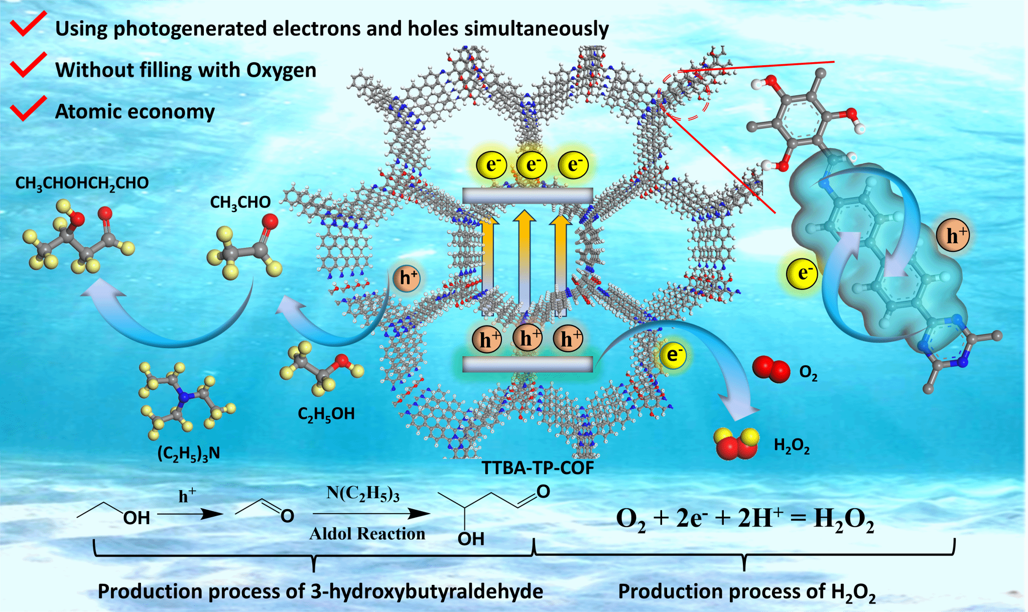 创新性地提出了光生电子和空穴全利用策略。在光催化光生电子还原氧气生成过氧化氢的同时,在少量三乙胺的碱性条件下,发生光生空穴氧化乙醇为乙醛和乙醛羟醛缩合为3-HBA的级联反应,为工业和环境领域提供更加绿色、安全和经济的解决方案。