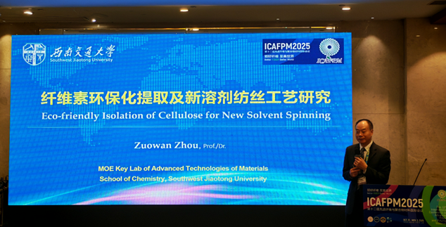 周祚万教授应邀在“绿色可持续发展论坛”上作题为“天然纤维素环保化提取和新溶剂纺丝工艺研究”的主题报告(Keynote Speech),系统报告了团队在天然纤维素绿色提取技术、新型溶剂纺丝工艺和相关领域方面的研究进展,受到与会专家的广泛关注和热烈讨论。会后,多位专家学者以及中国纺织工业联合会、中国化学学会高级专员与周教授进行了深入交流,探讨了相关技术的前景与推广应用途径。肉漫