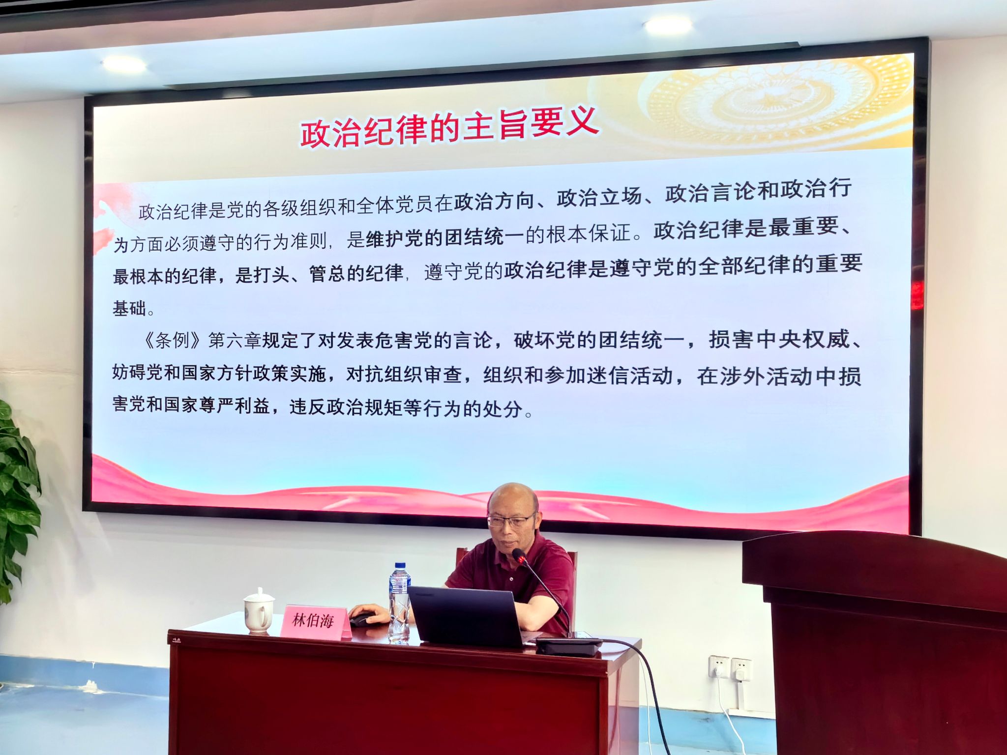 林伯海同志指出,中国共产党是勇于自我革命的政党,从严管党治党是我们党最鲜明的品格。习近平总书记讲过,“党性教育是共产党人修身养性的必修课,也是共产党人的‘心学’”。林教授强调,全体党员同志要重点学习“六项纪律”“四种形态”和“三个区分开来”,学习“四个必须”和“八条规范”,做对党忠诚、个人干净、勇于担当的新时代好干部。