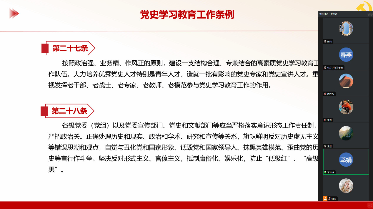 2024年3月14日下午14:00,应用化学党支部结合支部党员实际情况,在前期充分自学的基础上,通过线上线下相结合的方式,全体支部党员集体参与3月主题党日活动。主题党日活动主要学习内容包括习近平总书记在中共中央政治局第十一次集体学习时的重要讲话精神、教育部党组书记、部长怀进鹏在《求是》杂志发表的署名文章《厚植爱国情怀培育时代新人》、以及《党史学习教育工作条例》。党支部书记王萃娟同志主持活动,对学习内容以及传达的精神做出详细讲解。肉漫