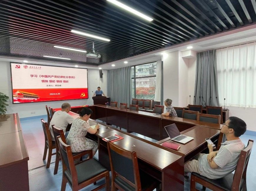 为推动党纪学习教育走深走实,党支部书记郑剑峰同志为全体支部成员讲授“慎独 慎初 慎微 慎欲”专题党课,带领支部成员持续深入学习《中国共产党纪律处分条例》。郑剑峰从慎独、慎初、慎微、慎欲四个方面进行了深入阐述。慎独是在个入独处、人所不知之处,仍坚守内心的道德原则,自我约束、自我警醒。慎初是注意事情的初始,走好人生第一步。慎微是防微杜渐,每走一步、做一事,都战战兢兢、如临深渊、如履薄冰,时刻保持清醒和理性。慎欲则提醒我们要学会控制欲望,欲望无止境,懂得知足,珍惜已有的幸福。郑剑峰同志进一步带领大家明确了党的纪律的基本要求和标准,为党支部成员加强自身建设提供了重要的依据和准则。