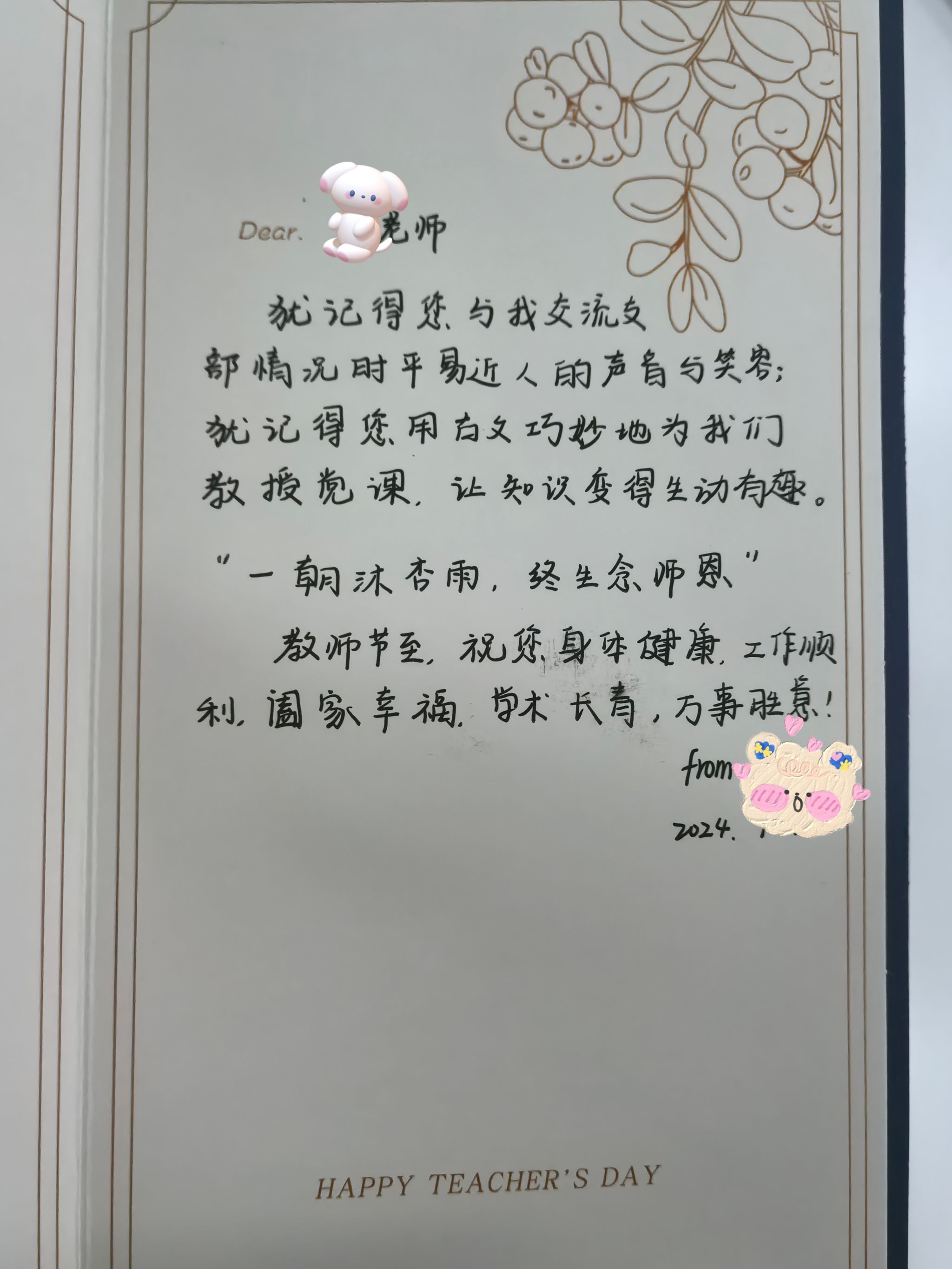 教师节快乐!其实我一直都特别佩服您,因为您的每一堂课都超有趣,讲得特别清晰明了,连那些原本觉得有点枯燥的知识点,经过您的讲解后都变得生动起来了。