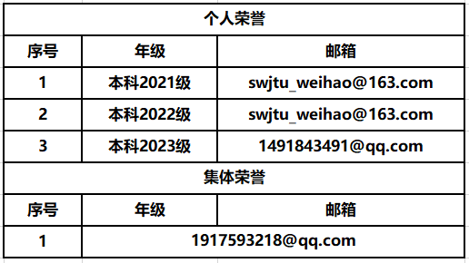1.个人荣誉:学生网上申请成功后,需于10月8日12:00前将主要申请材料证明,电子版打包命名为:学号-姓名-个人荣誉称号-拟从班级/学生组织参评(例:2021110000-张三-三好学生-拟从班级参评),电子版材料发送至指定邮箱,纸质版复印件提交至X2413B各年级辅导员处。
