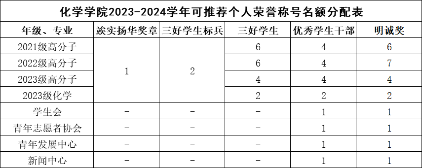 4.同一学年内“竢实扬华奖章”、“三好学生标兵”、“三好学生”、“优秀学生干部”、“明诚奖”不可兼得;“忠忱班集体”、“先进班集体”、“特色班集体”不可兼得。