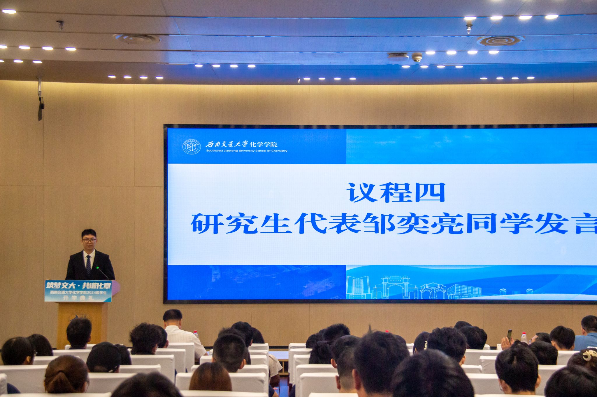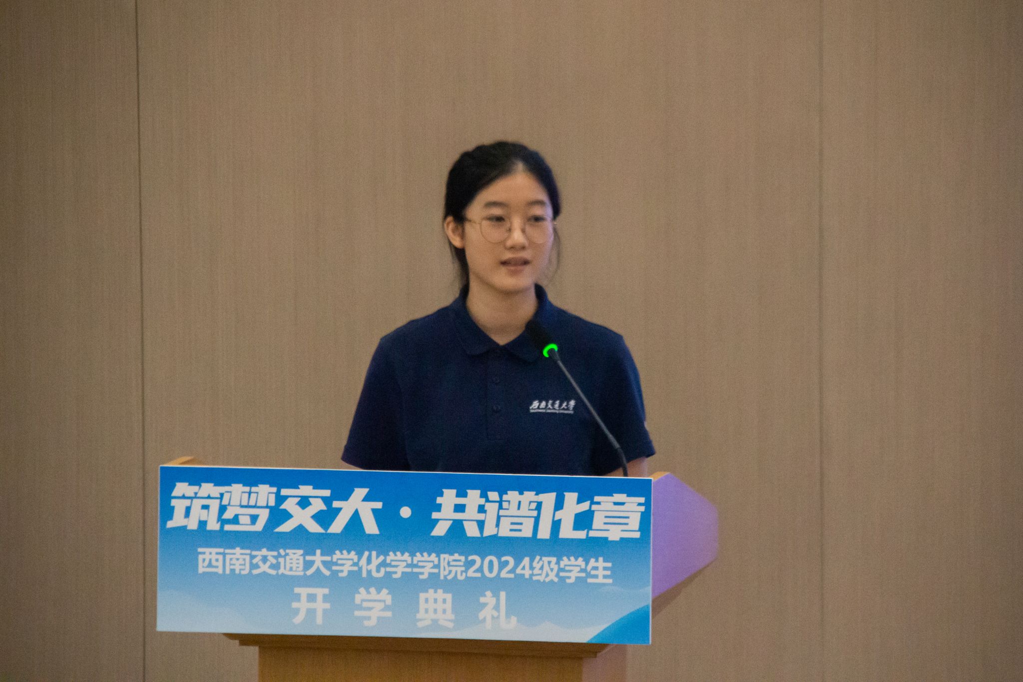本科生新生代表易佳盈同学回顾了过去高中的辛勤与成长,期待以交大为梦想的新起点,在化院的四年里,将通过刻苦学习、参加活动、提升素质,共同探索科学与创新。希望能在交大的沃土上,让青春在奋斗中绽放光彩。