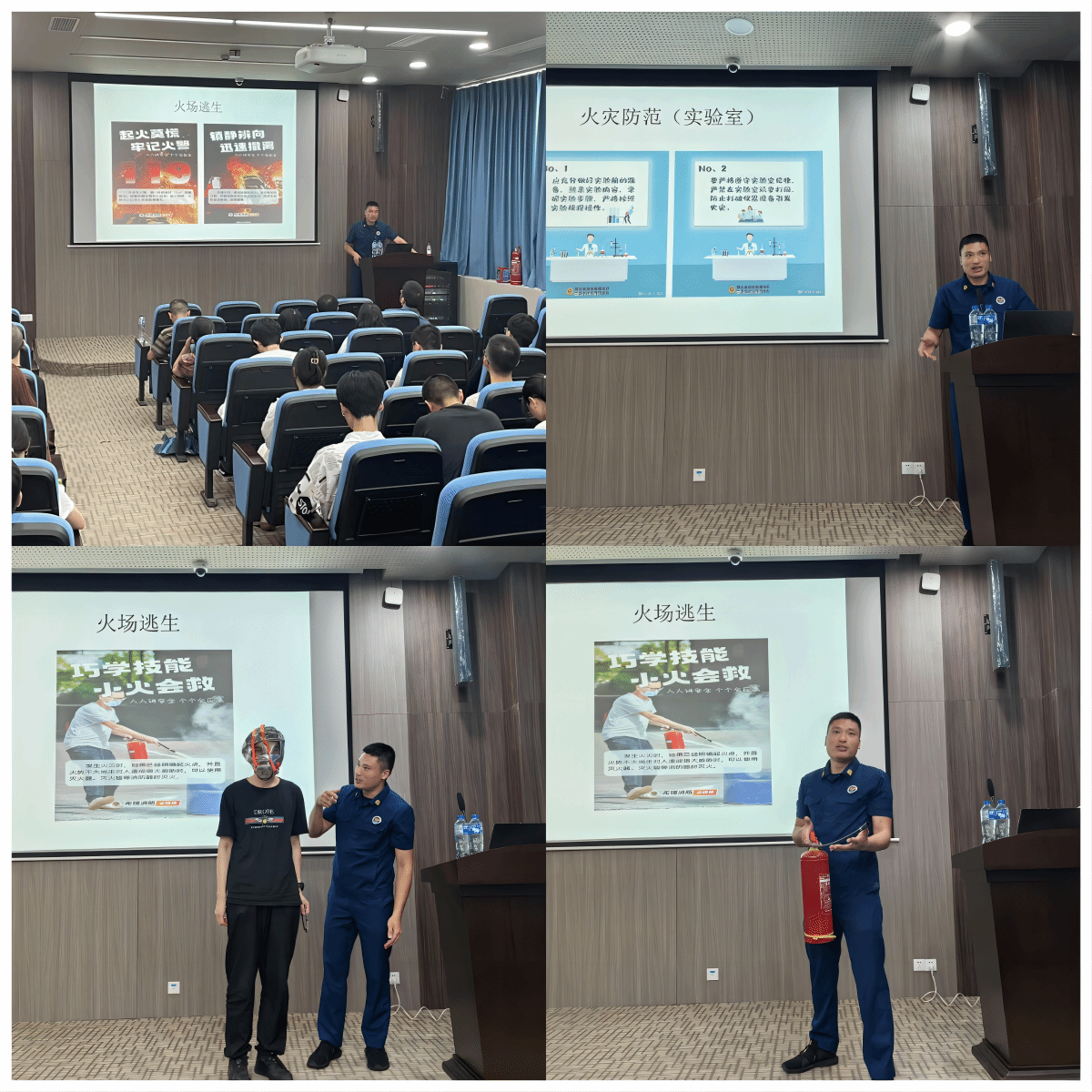 随后,刘伟详细介绍了火场逃生的基本原则。他强调,无论是在实验室工作和生活中,掌握基本的应急自救技能是非常有必要的。紧接着,刘伟现场详细讲解了过滤式消防自救呼吸器和灭火器的使用方法,包括提起灭火器、把保险销、紧握喷管、在上风口对准火焰根部喷射。